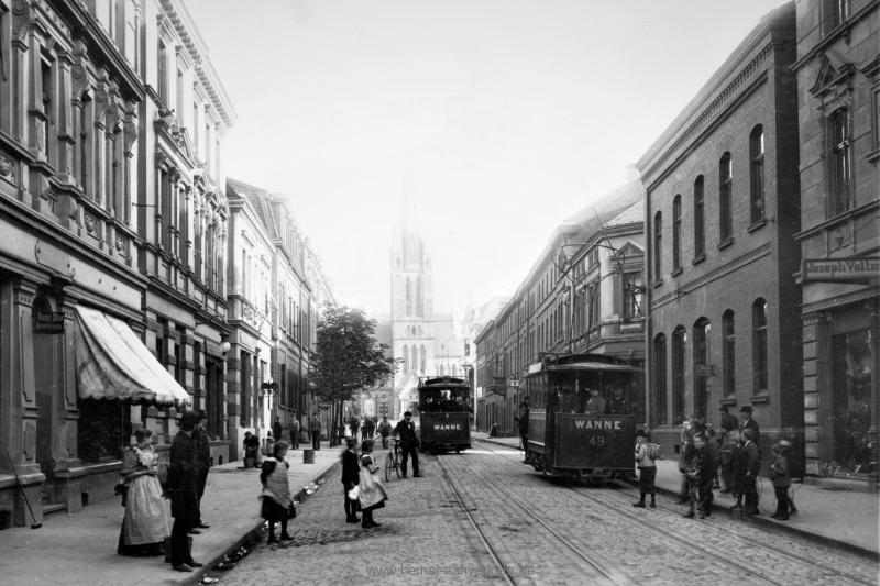 Nach etwa 300 Metern war die Grenze nach Eickel erreicht. Nach einer weiteren 90-Grad-Kurve fuhr die Straßenbahn auf der rechten Seite der damaligen Bochumerstrasse (heute Eickeler Straße) und durch die sehr enge Herzogstrasse zum Eickeler Markt.